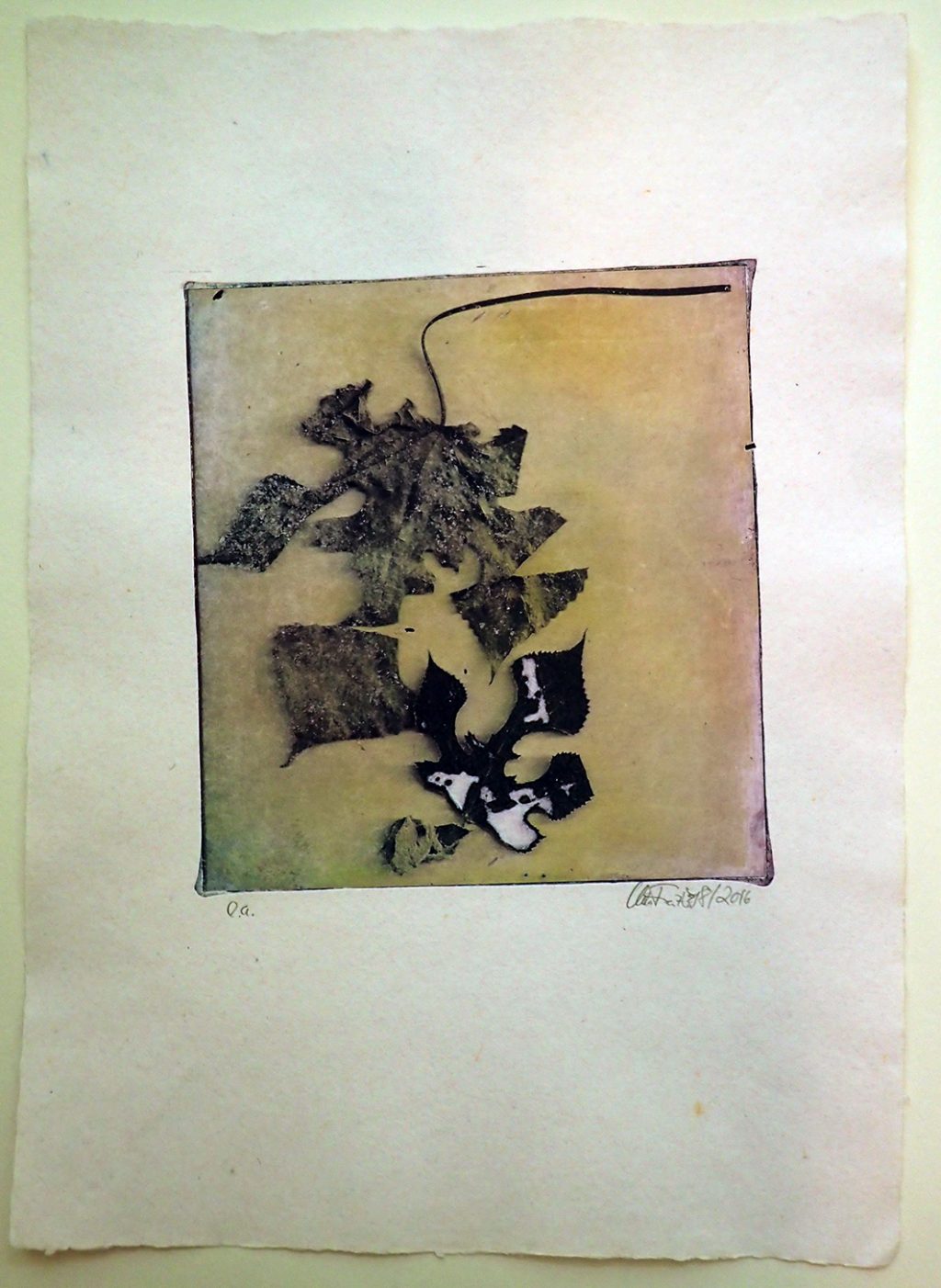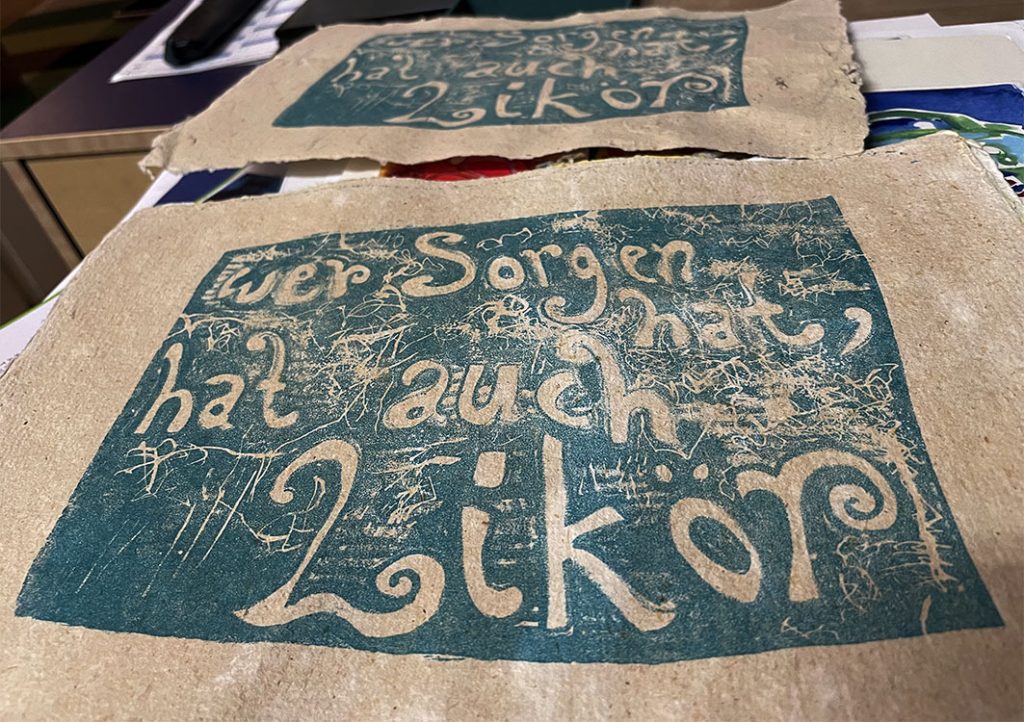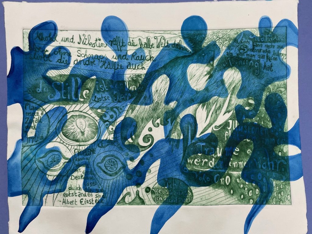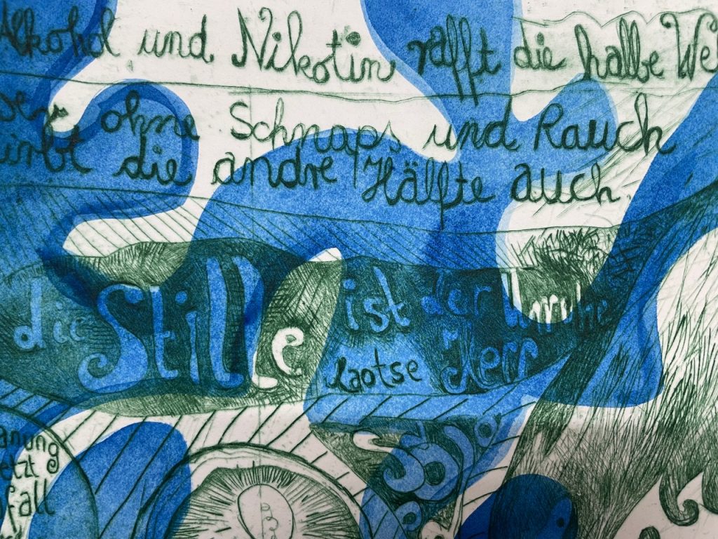 Spruch-Graphik, Kaltnadelradierung mit Aquarell, 2026, Ausschnitt